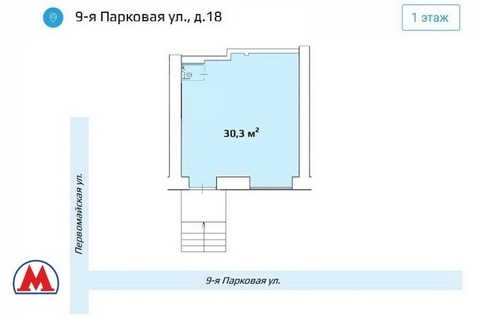 Street-retail помещение торгового или свободного назначения 30,3 кв.м на 1 этаже кирпичного жилого дома по адресу: ул. Парковая 9-я, д. 18